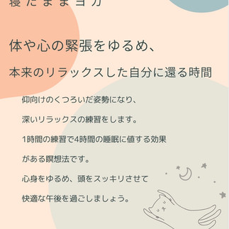 午後のお昼寝時間にセルフケアはいかがでしょうか? 睡眠不足。 ストレスなどによる慢性疲労。 休んでるつもりだけど、疲れを感じる。 リラックスの仕方がわからない。 寝たままヨガは、楽な仰向けの姿勢になり、声のガイドに耳を傾けながら 心身のリラックスした状態を促す練習です。 1時間の練習で4時間分の睡眠に値すると言われるヨガは、 ストレスによる無意識の心身の緊張、こわばりをゆるめていきます。 本来のリラックスした自分に還る時間。 快適で穏やかな日々を過ごしましょう。